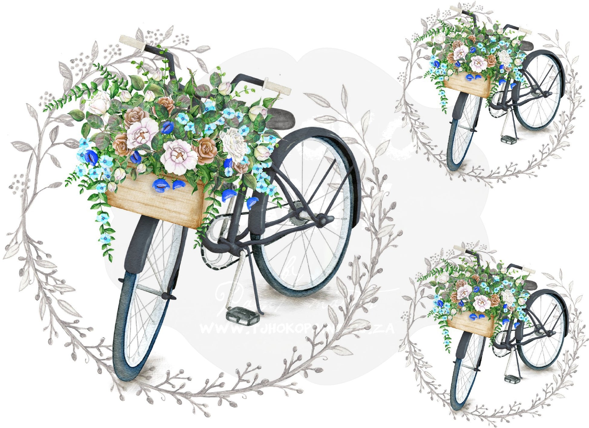 Infuse your projects with timeless charm using Tjhoko’s Vintage Bicycle with Roses and Blue Blooms water transfer. Featuring a beautifully illustrated bicycle filled with soft blush roses, lush greenery, and delicate blue flowers, this design adds elegance and romance to any décor piece.
