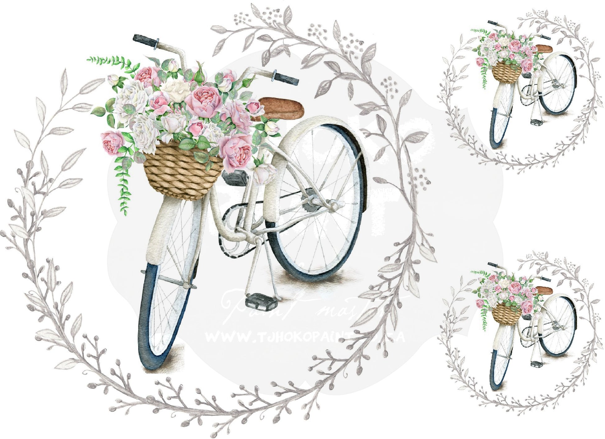 Bring gentle romance and timeless charm to your next project with Tjhoko’s Vintage White Bicycle with Roses water transfer. Featuring a delicate hand-painted bicycle adorned with pink and white roses in a woven basket, this design captures the essence of calm, countryside living.